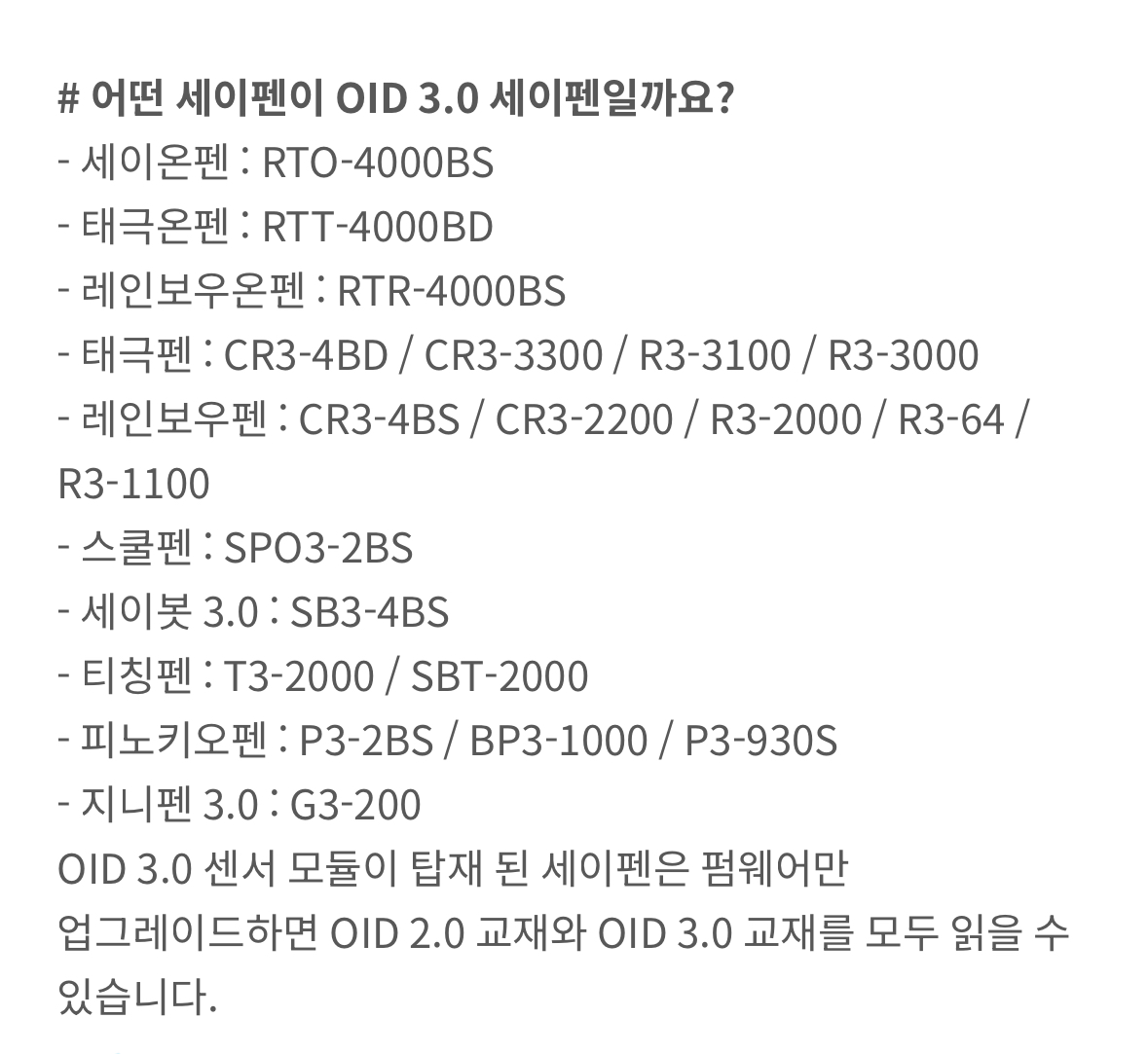 세이펜은 외관이 똑같아도 내부 사양이 다릅니다. 가장 먼저 확인해야 할 것은 모델명에 **'CR3'**가 포함되어 있는지입니다. (예: CR3-4BS, CR3-1100, CR3-2200등)